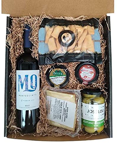 Una Caja regalo de picoteo con vino de crianza, quesos en cuña y para untar, pate de jamón, aceitunas y colines. Un aperitivo en toda regla que le encantara.