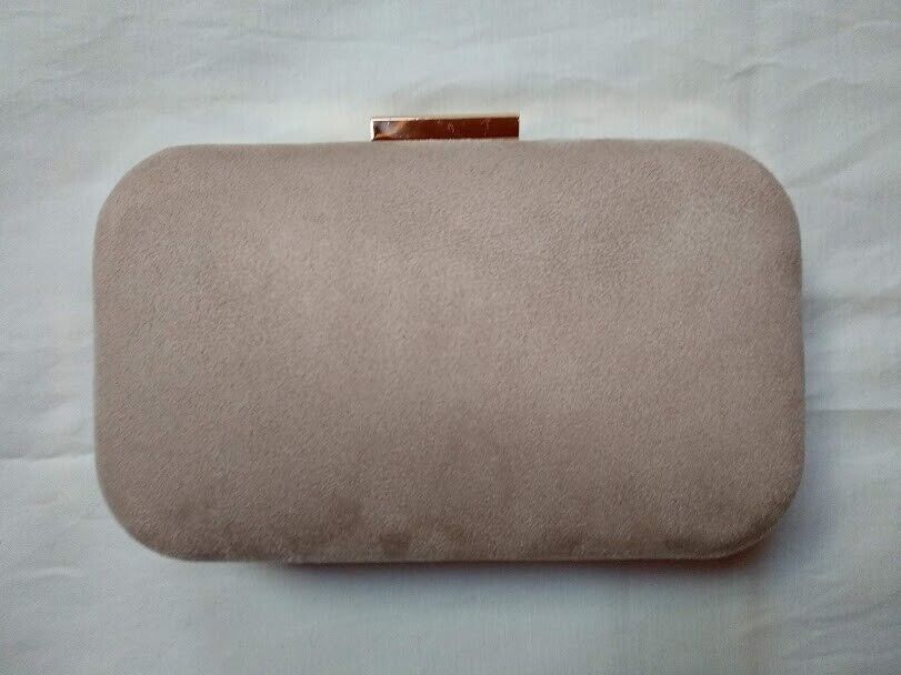Bolso de fiesta ,clutch cartera de mano en antelina color crudo y bandas doradas en su parte delantera