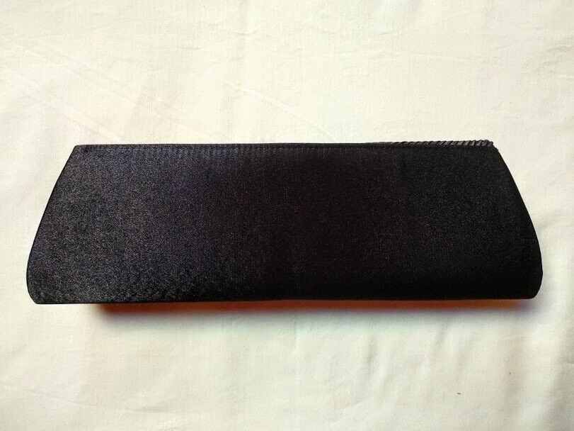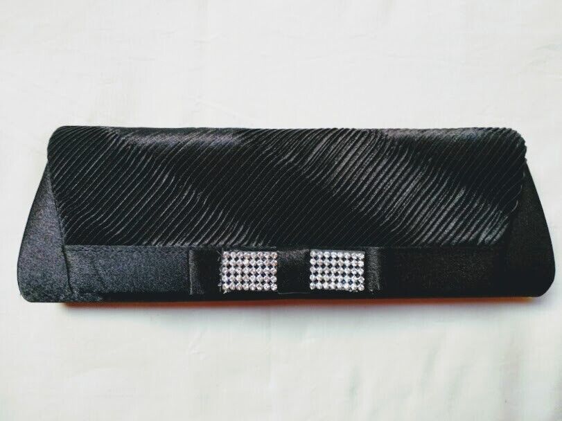 Bolso de fiesta ,clutch cartera de mano en raso color negro con jaretas y adorno de lazo con símiles en la parte frontal.