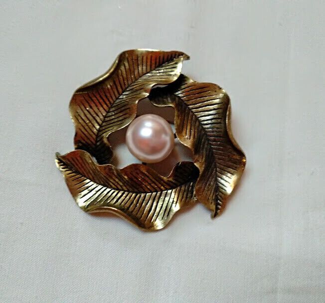 Bonito broche de bisutería en metal dorado envejecido compuesto por tres hojas y rematado en su parte central por una perla blanca.