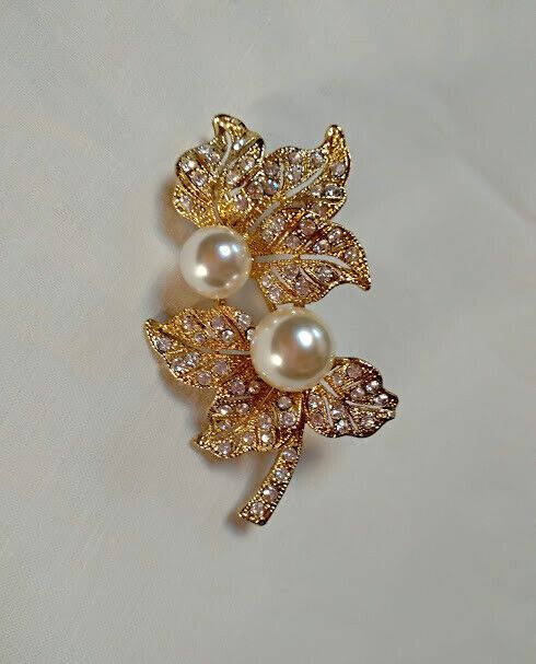Bonito broche de bisutería dorado con forma de 2 hojas cuajado de símiles blancos y dos perlas.