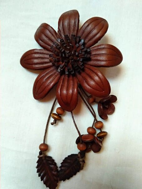 Bonito broche de cuero con forma de flor y colgantes móviles en su parte inferior