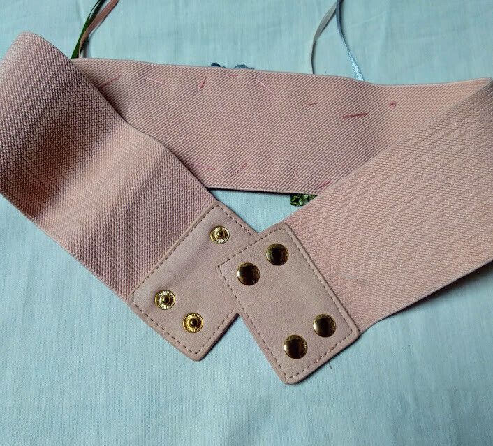 Precioso cinturón elástico de mujer tipo bohemio con goma elástica de color salmón .En su parte central lleva un adorno de flores bordadas en relieve realizado con cintas de raso en tonos azules,salmon,beig,verdes y amarillos.