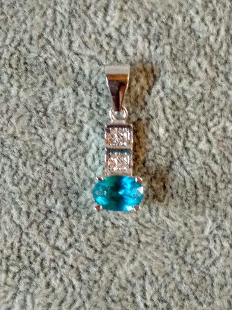 Colgante en Plata de 1ª Ley Rodiada con forma alargada con una bonita piedra de color azul tallada engastada con garras.