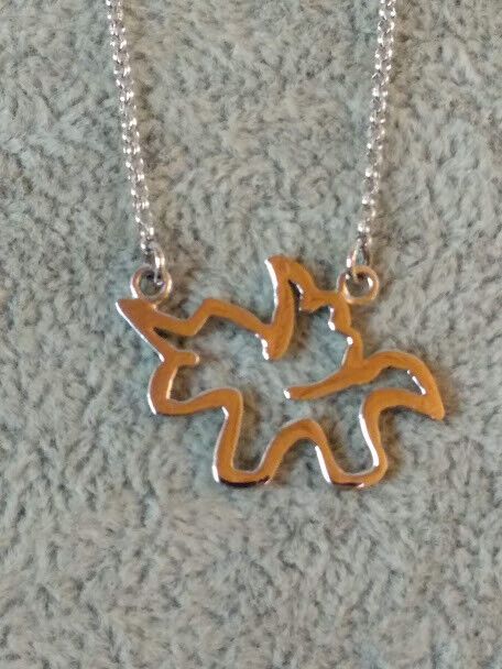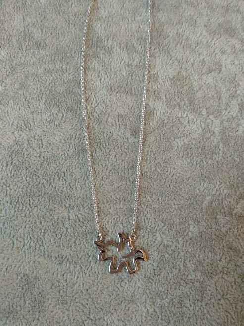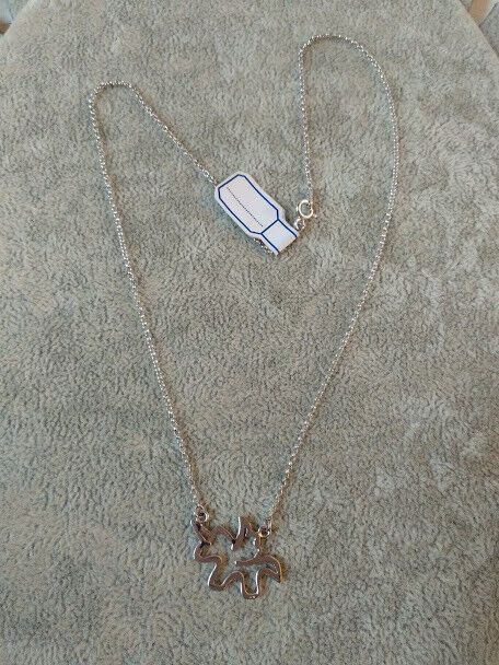 El colgante tiene un tamaño de 1 cm de largo y no tiene asa ,la cadena va fija en la figura con dos asas . La cadena es de eslabones sencillos..Esta cadena se cierra con un broche tipo reasa donde lleva una pequeña chapa con el contraste garantizando que es plata de 1ª ley.La cadena mide 40 cm de largo y 1 mm de grosor cada lado.