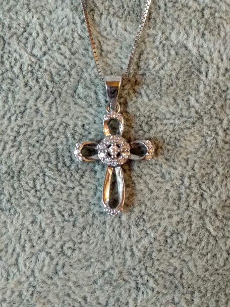 La cruz mide unos 2,5 cm de largo incluyendo la reasa por 14 mm de ancho y la cadena es de eslabones tupidos de forma cubica que tiene 4 lados lisos y planos.Esta cadena se cierra con un broche tipo reasa donde lleva una pequeña chapa con el contraste garantizando que es plata de 1ª ley.La cadena mide 40 cm de largo y 1 mm de grosor cada lado.