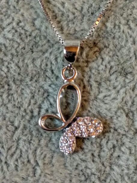 Preciosa y delicada gargantilla en Plata de Ley con acabado de rodio con colgante con forma de mariposa con una de las alas cuajada de circonitas.