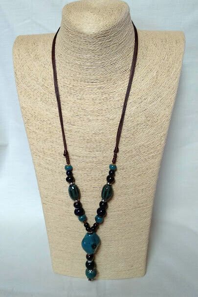 Original collar tipo étnico combinado de cuentas de cerámica en tonos azules con cordón encerado.