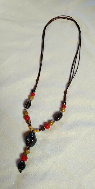 Original collar tipo étnico combinado de cuentas de ceramica en tonos ocres con cordón encerado.