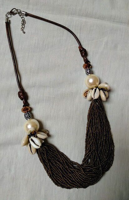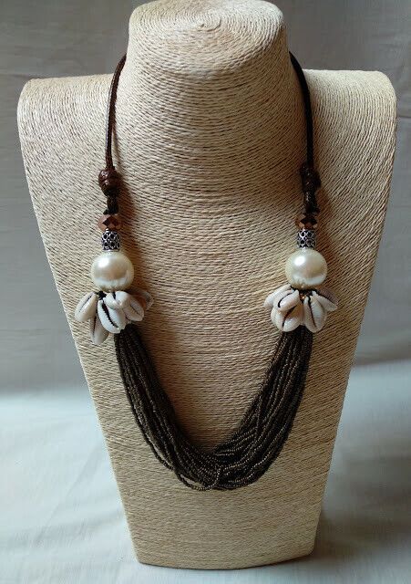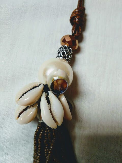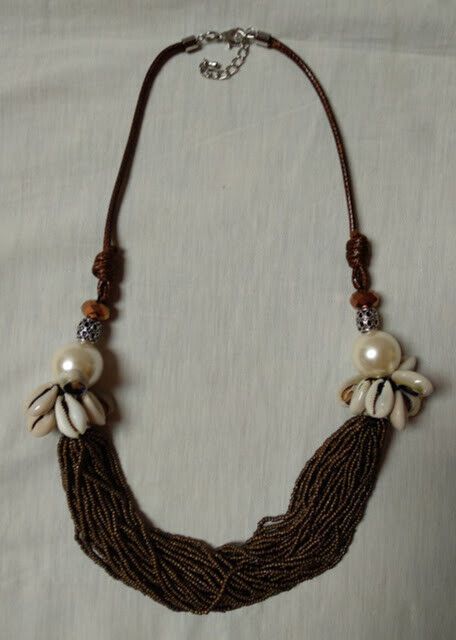 Original collar tipo étnico combinando cordón, cristal, perlas, conchas naturales y pequeñas cuentas.