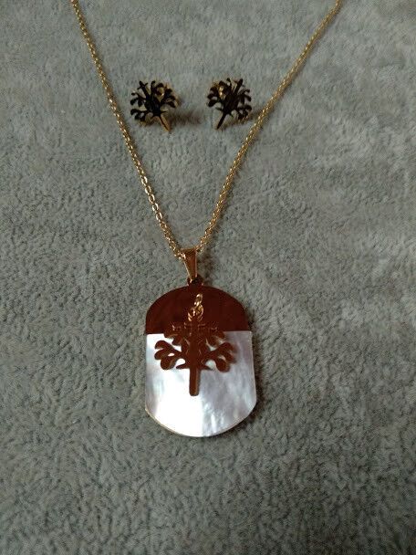 El colgante es una chapa de acero cubierta en parte por madreperla y con un colgante en acero del árbol de la vida .Su tamaño es de 3 cm de alta X 2 cm de ancho aproximadamente sin contar el asa para que pase la cadena y el colgante del árbol mide aproximadamente 1,5 cm de diámetro.
