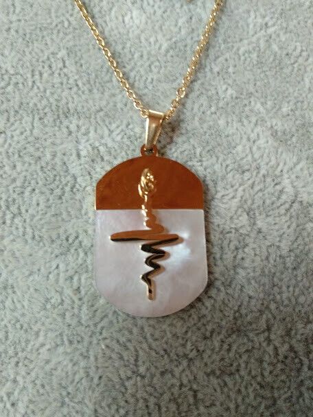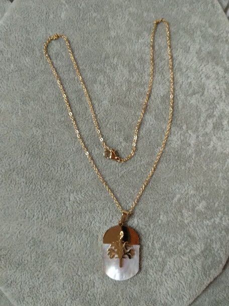 El colgante es una chapa de acero cubierta en parte por madreperla y con un colgante en acero .Su tamaño es de 3 cm de alta X 2 cm de ancho aproximadamente sin contar el asa para que pase la cadena y el colgante 2 cm de largo aproximadamente .