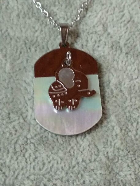 El colgante es una chapa de acero cubierta en parte por madreperla y con un colgante en acero con forma de elefante .Su tamaño es de 3 cm de alta X 2 cm de ancho aproximadamente sin contar el asa para que pase la cadena y el colgante 1,5 cm de alto X 1 cm de ancho aproximadamente .