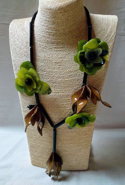 El collar esta compuesto por tres flores en tonos verdes y tres ramitos de hojas marrones.Tiene una longitud de 40 cm aproximadamente y aunque no es necesario desabrochar lo para ponérselo el cierre es un bonito botón.