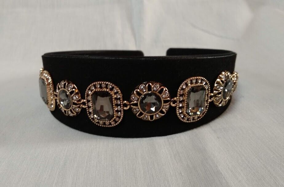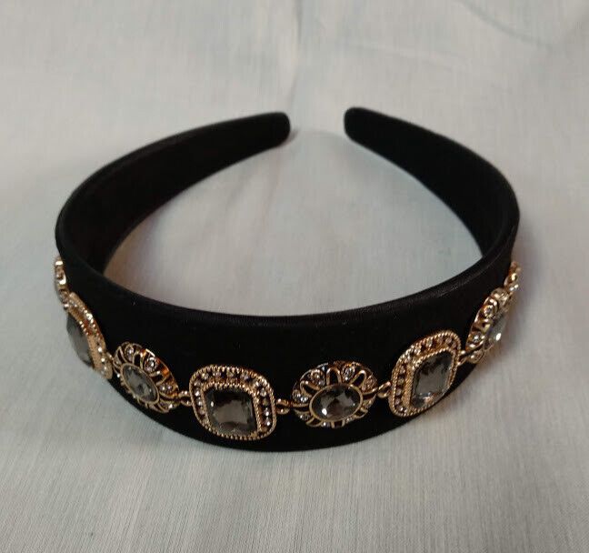 Bonita diadema para mujer en satén negro con apliques de pedrería de color cristal ahumado.