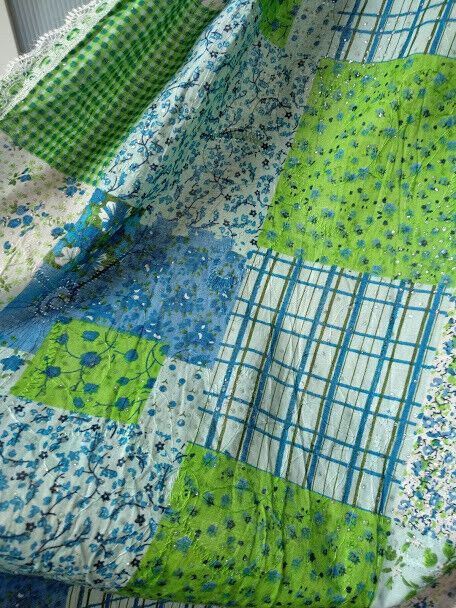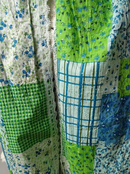 Precioso colorido en tonos azules y verde con estampado imitando pachwork con pequeños brillantitos salpicados y bordados de silueta de flores.Rematado todo su contorno con una puntilla.