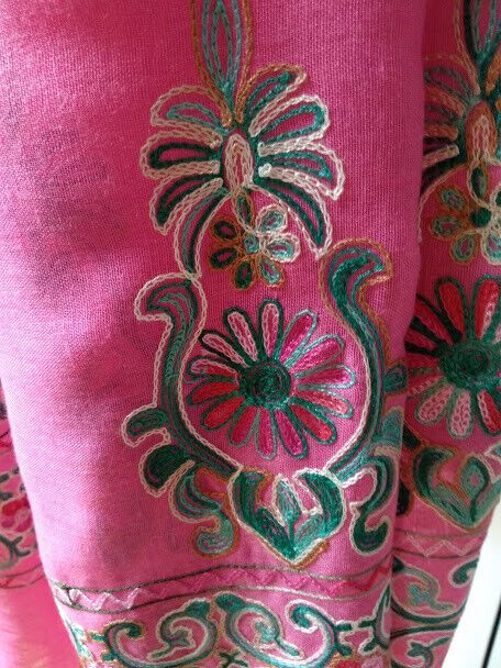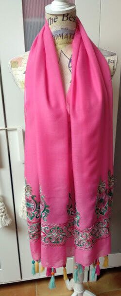 Precioso color rosa fucsia con bonito bordado en los extremos y rematado con flecos con abalorios de madera.