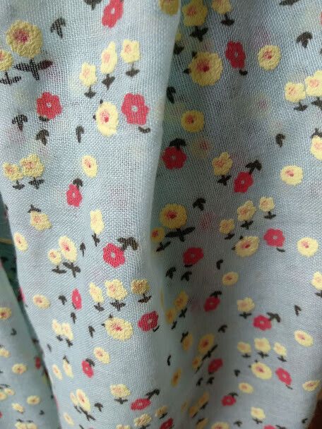 Delicado fular de mujer con estampado de flores y pequeños borlones en los extremos.