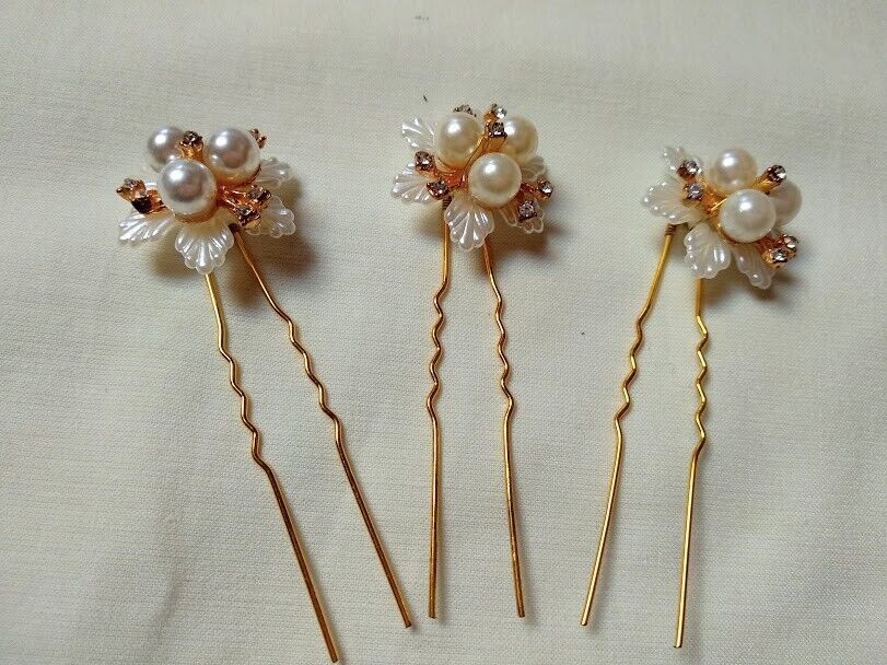 Bonitas horquillas moño mujer para adornar el pelo en color dorado combinando perlas y símiles color blanco de diferentes tamaños