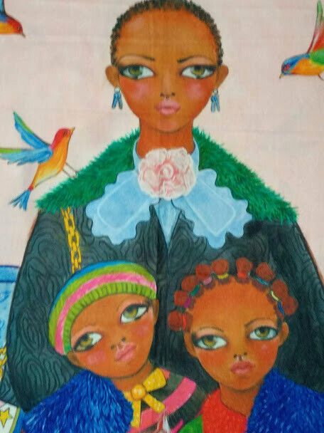 Estampado en una cara con posado de una mujer con dos niños y gatito.En la otra cara es lisa de un dulce color salmon como se muestra en la foto detalle.