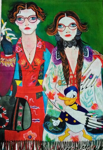 Estampado en una cara con una pareja y el pato Donald en la parte inferior como guiño.En la otra cara es lisa de un dulce color verde botella como se muestra en la foto detalle.