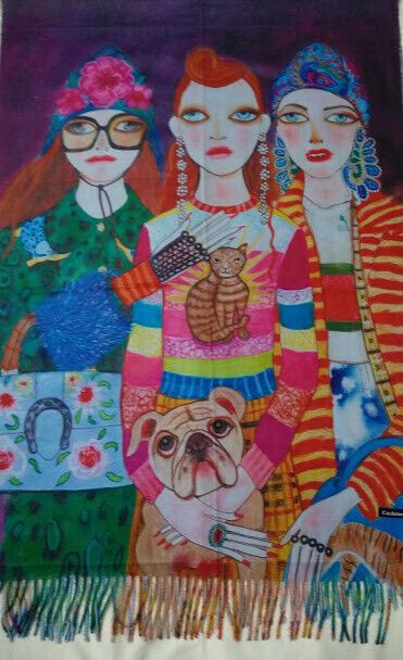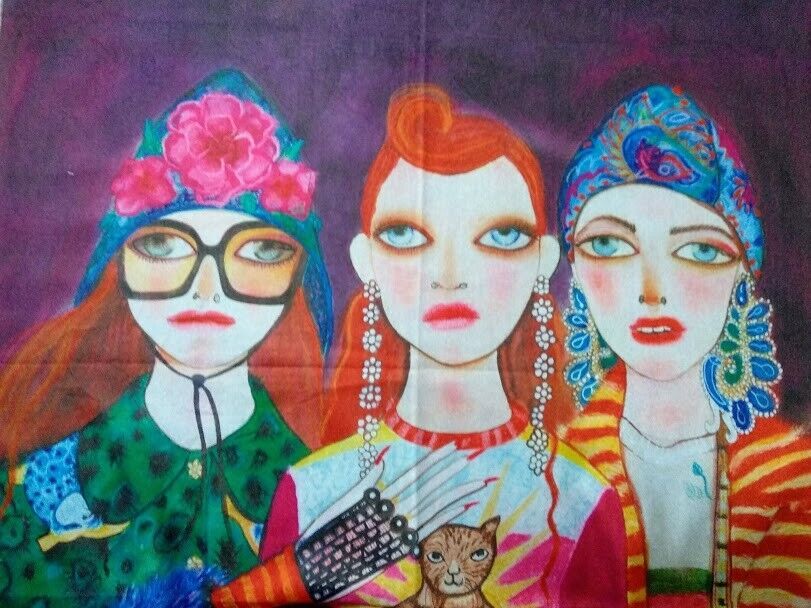 Estampado en una cara de tres chicas de gran colorido.En la otra cara es lisa de un dulce color azul claro como se muestra en la foto detalle.