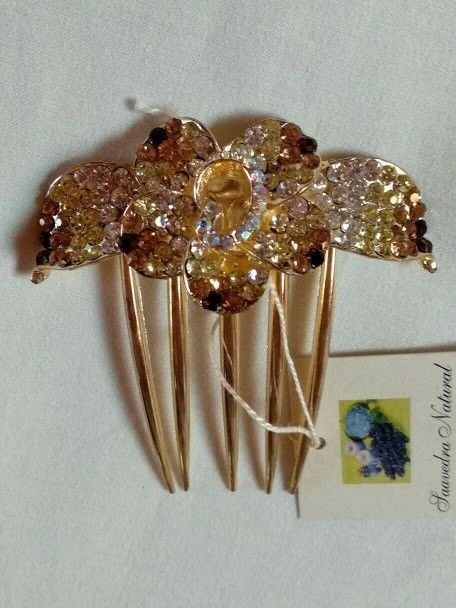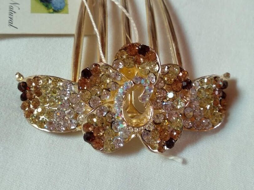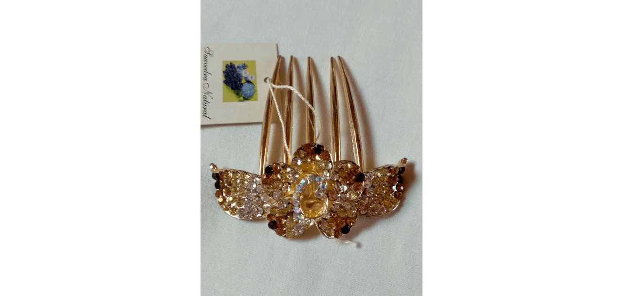 Bonita peineta mujer para adornar el pelo en color dorada con forma de flor cuajada de símiles en tonos del blanco al marrón.