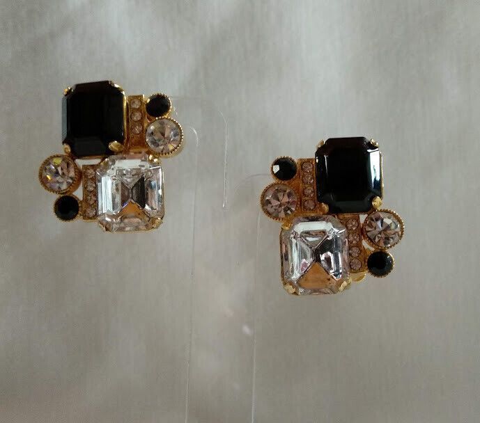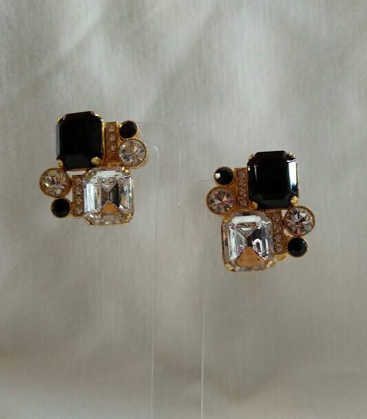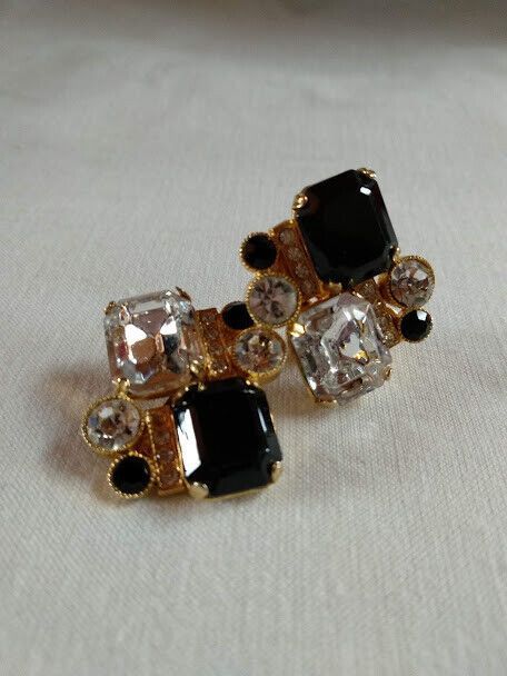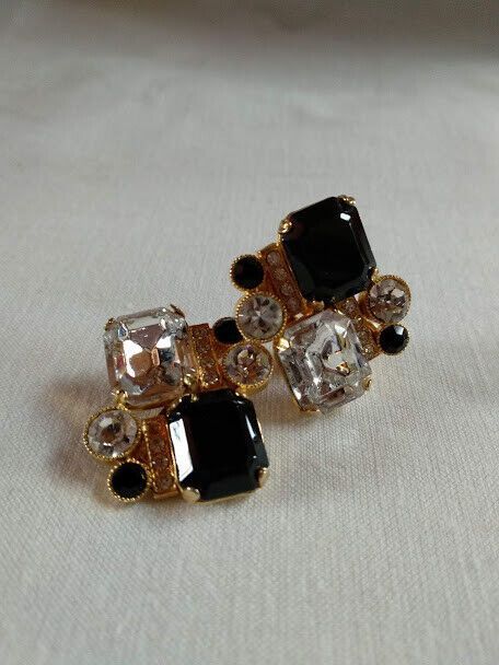 Elegantes y originales pendientes de bisutería dorados compuestos de cristales blancos y negros con cierre de clip.