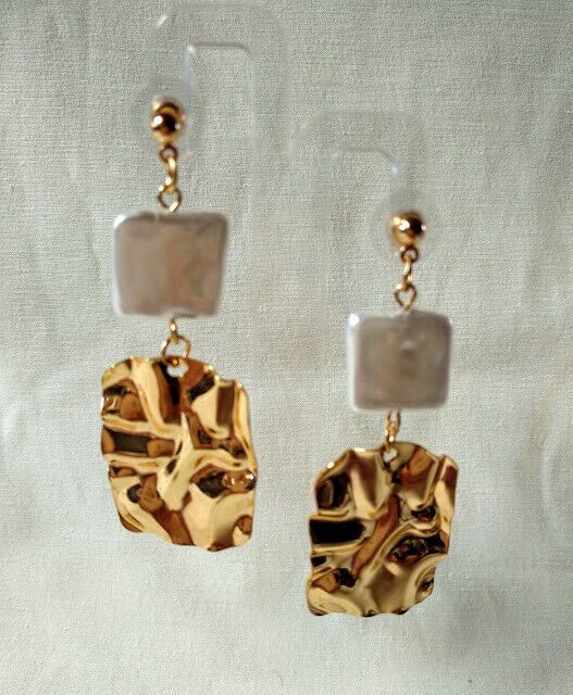 Elegantes y juveniles pendientes de mujer largos con adorno dorado y madreperla.
