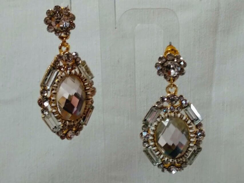 Elegantes pendientes de bisutería dorados de nuestra colección modelo Isabel Compuesto de bonitos cristales blancos tallados de diferentes formas y tamaños.
