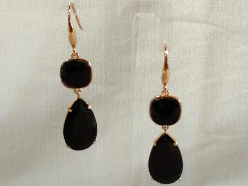 Elegantes pendientes de bisutería dorados de nuestra colección modelo Lagrima con piedras sinteticas de color negro talladas.