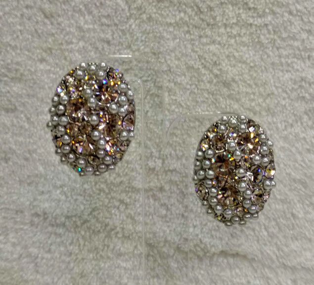 Elegantes pendientes de bisutería plateados de forma ovalada cuajados de símiles blancos con cierre de clip.