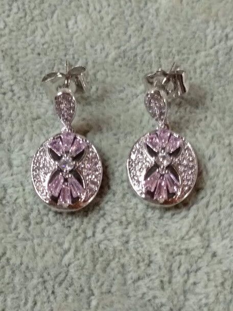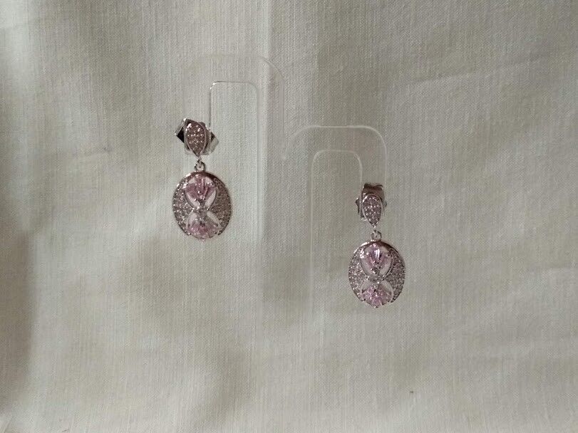 Preciosos pendientes bisuteria rodiada cortitos con piedras naturales rosa claro y cuajados de circonitas blancas.