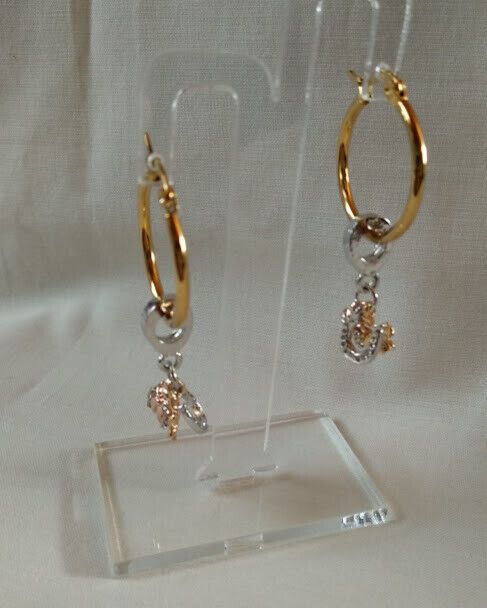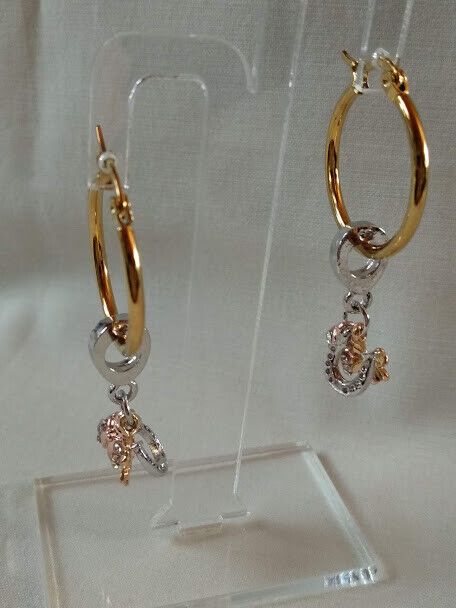 Preciosos y exclusivos pendientes de aro en acero dorado anti-alérgicos con colgante tipo pandora compuesto por una mariquita,una flor y una herradura en dorado y plateado.Se pueden usar con el colgante o quitando lo se convierte en un sencillo pendiente de aro. Los aros tienen un diámetro de 2,4 cm y los fetiches del colgante tienen un tamaño de 1 cm aproximadamente. Únicos y exclusivos Elegantes y femeninos para completar tu look mas sofisticados en eventos o veladas especiales o para tu día a día. Todos nuestros envíos son certificados y se realizan desde España.Suelen llegar en un máximo de 4 a 5 días laborables Por favor si el pedido se realiza desde Canarias tener en cuenta los especiales gastos de envío así como facilitar el nº de D.N.I. Gracias.