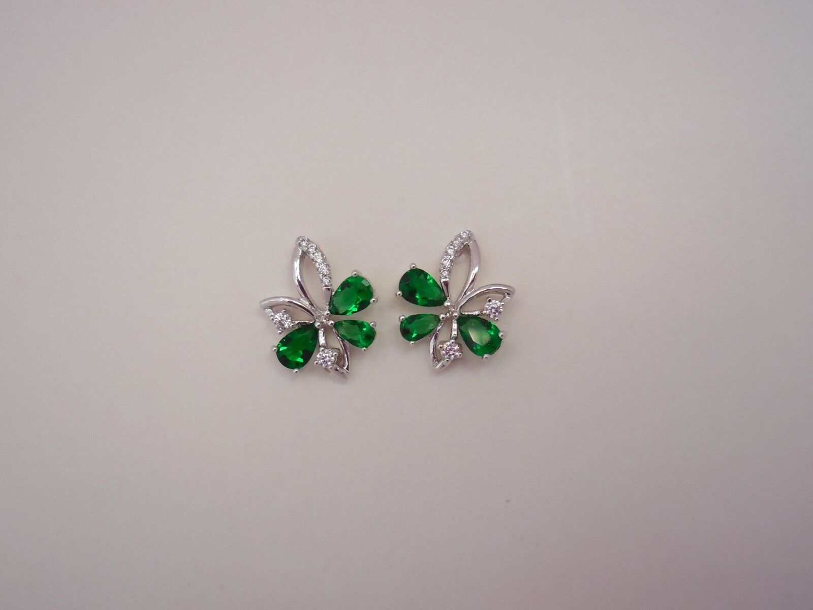 Bonitos pendientes de bisutería plateados con piedras blancas y verdes.
