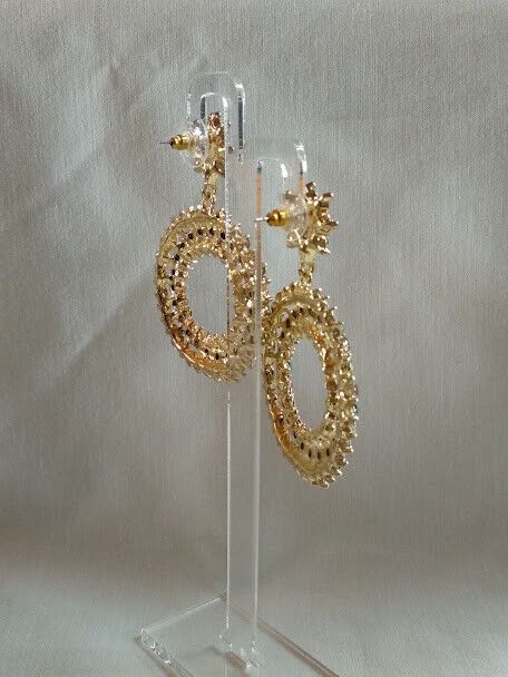 Elegantes pendientes de bisutería dorados cuajados de piedras multicolor.