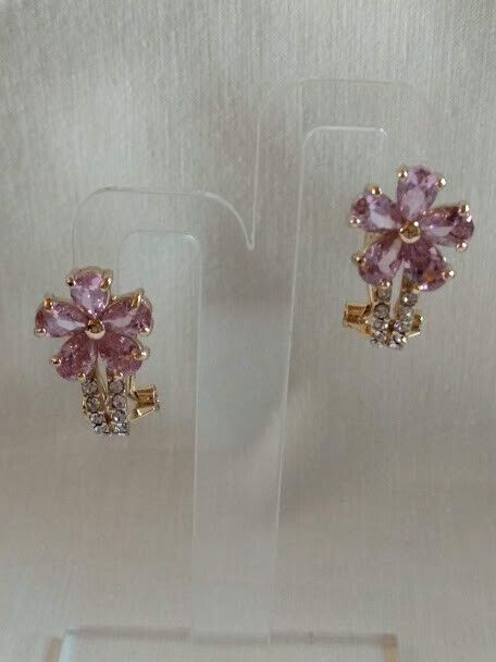 Pendientes de mujer bisutería dorados con flor cuajada de cristales rosas y blancos.