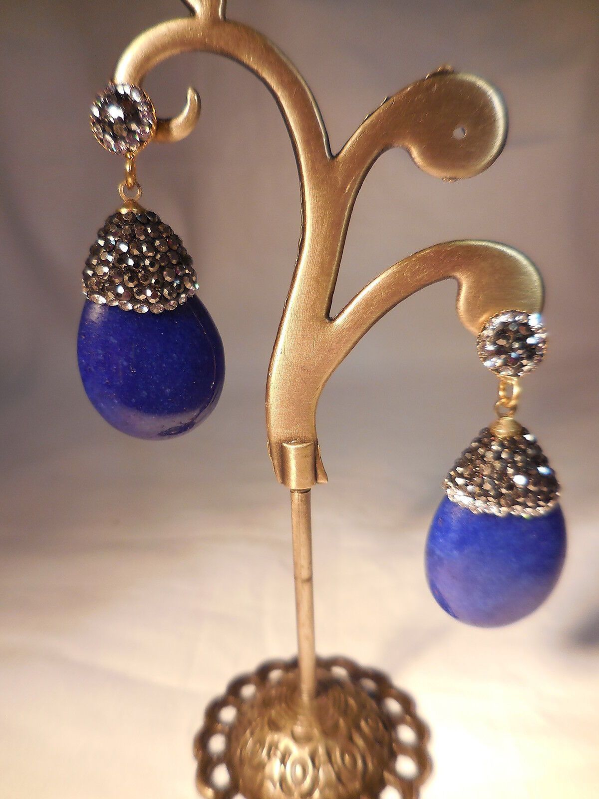 Preciosos y exclusivos pendientes de bisuteria con piedras naturales color azul lapizlazuli combinados en su parte superior con similes grises. Su sistema de cierre es presion. Elegantes y femeninos para completar tu look mas sofisticados en eventos o veladas especiales.