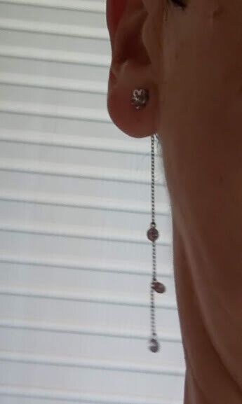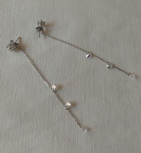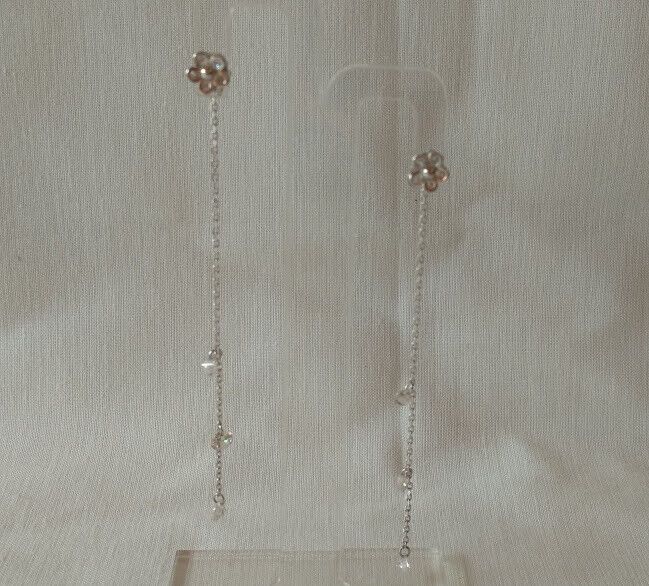 Preciosos pendientes en Plata de primera Ley rodiada de forma de flor con cadena que va sujeta en el cierre de presion o mariposa posterior con tres circonitas colgando.