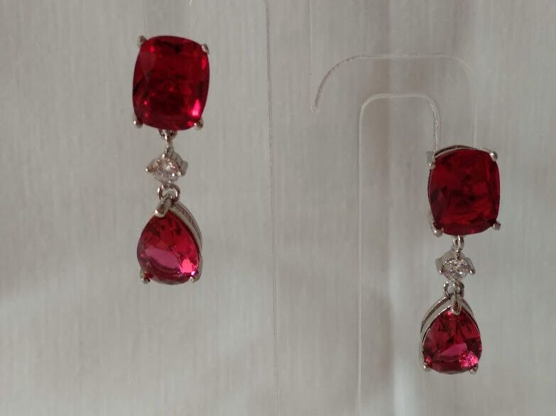 Preciosos pendientes en plata de ley rodiada largos con una piedra tallada rectangular y otra en forma de lagrima color rojo tambien tallada engastadas con garras con una circonita central color blanco que las une lo que le da movimiento al pendiente y ligereza.