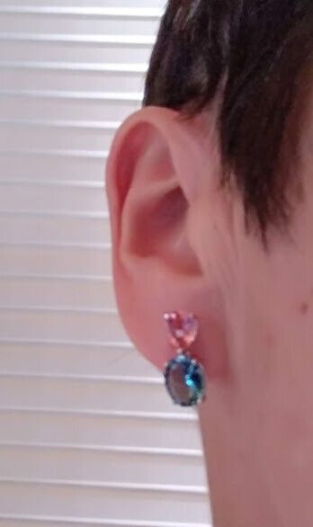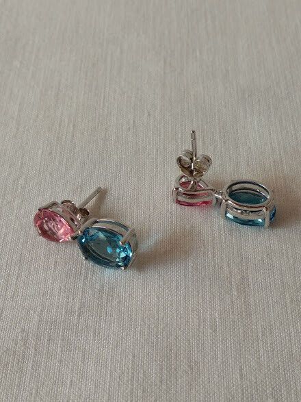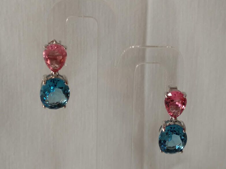 Preciosos pendientes en plata de ley rodiada largos con una piedra tallada rectangular de color azul claro y otra en forma de lagrima color rosa tambien tallada engastadas con garras.