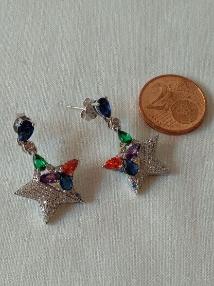 Preciosos pendientes en plata de ley rodiada largos con forma de estrella cuajada de pequeñas circonitas blancas y cuatro piedras mas grandes engastadas con garras en color verde,naranja,morado y azul.En la parte superior llevan una piedra de color azul en forma de lagrima tambien engastada con garras que es donde va el pasador que compone el cierre y atraviesa el lóbulo.