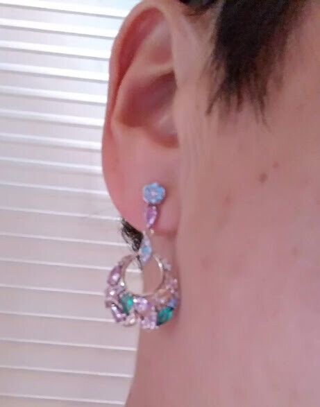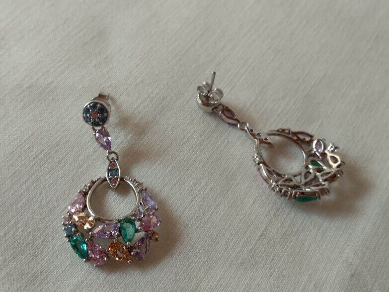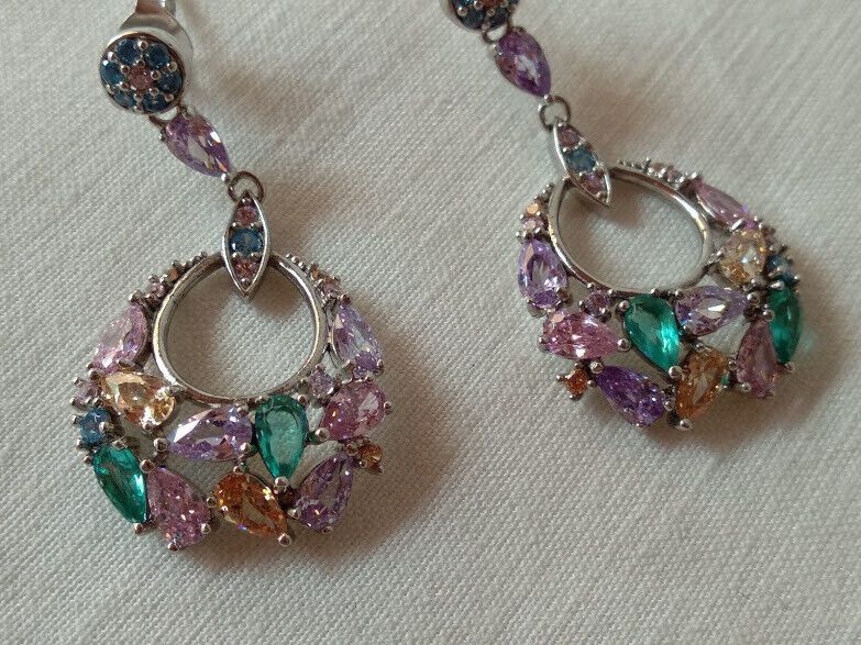 Preciosos pendientes en plata de ley rodiada largos cuajados de piedras en tonos pastel engastadas con garras