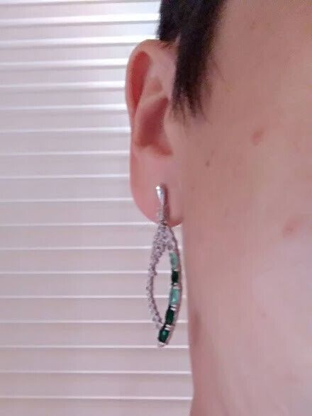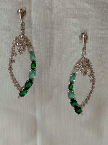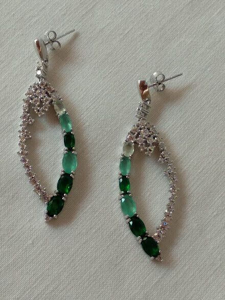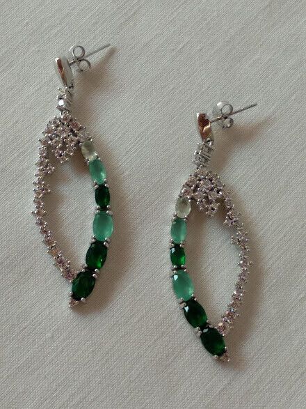 Preciosos pendientes en plata de ley rodiada largos cuajados de piedras en tonos verdes y blancas engastadas con garras
