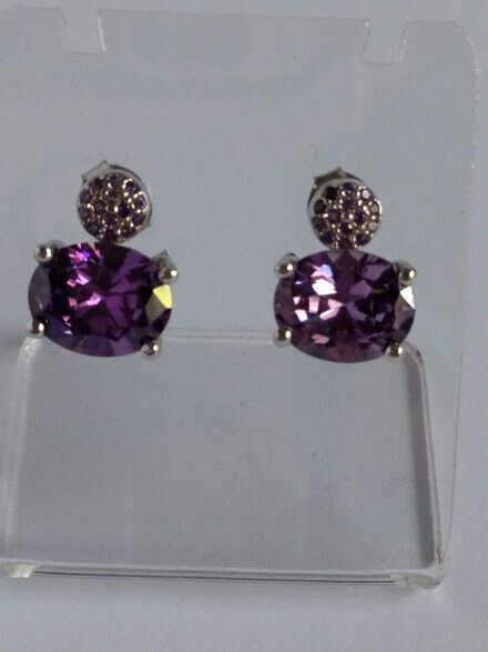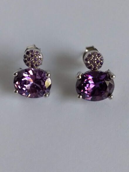 Preciosos pendientes tipo vintage en plata de ley rodiada con una amatista tallada en forma ovalada sujeta por 4 garras y en la parte superior lleva una pequeña bolita cuajada de piedrecitas que es donde va el pasador que atraviesa el lobulo para ponérselo.