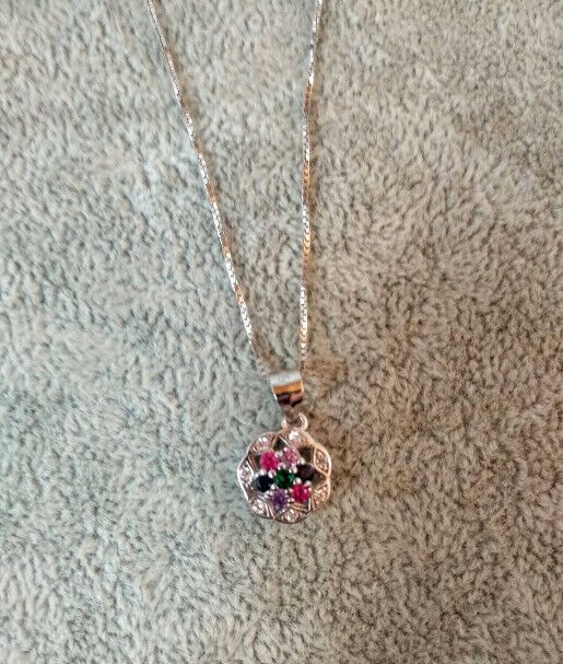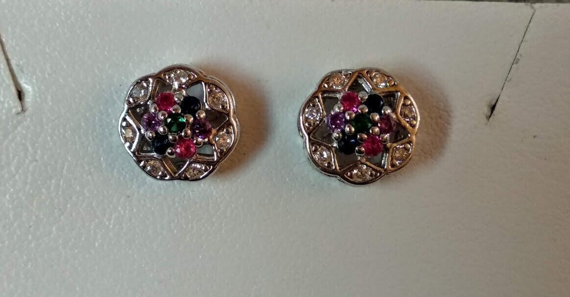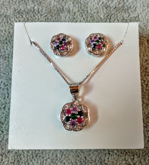 Precioso y delicado conjunto de pendientes y gargantilla en Plata de Ley con acabado de rodio de forma redonda con una estrella en su interior con pequeños rubies,zafiros y esmeralda engarzados con garras.
