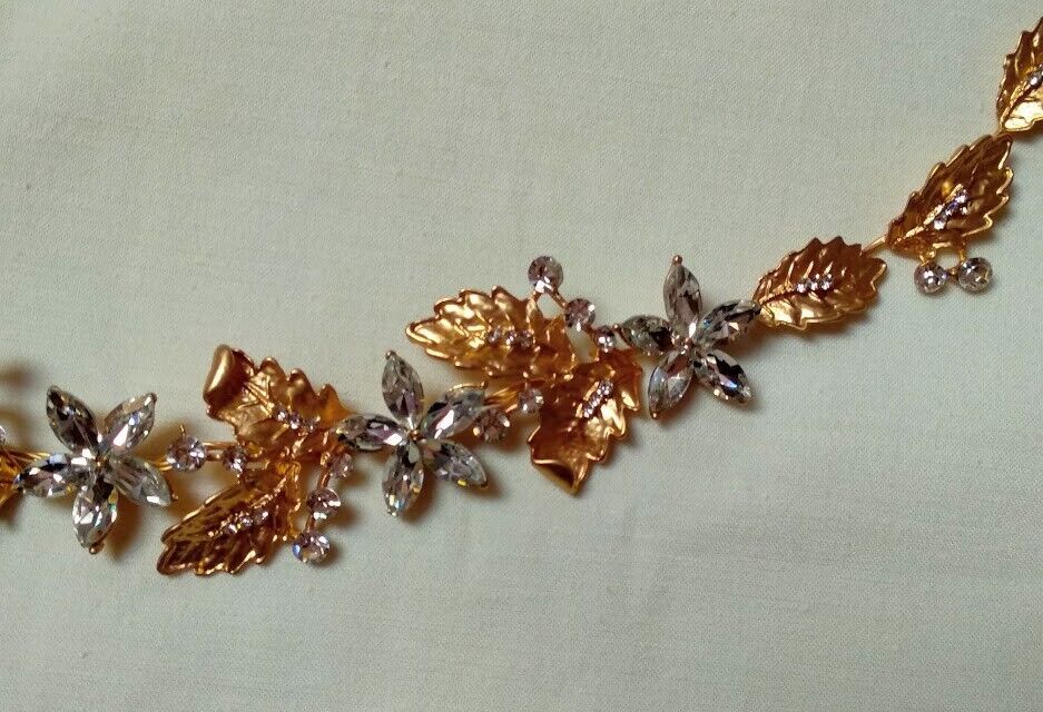 Bonito aderezo tiara color dorado con cristales de color blanco.