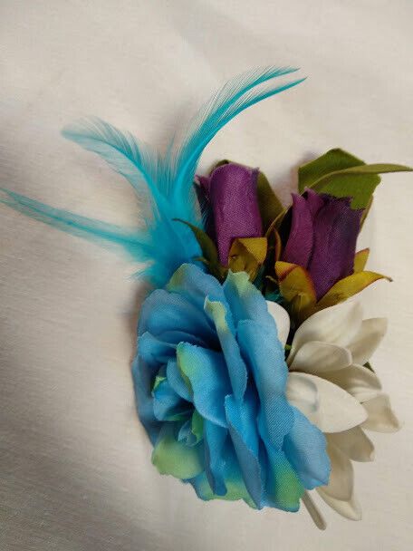Bonito tocado mujer de flores de tela en tonos azules y morados.