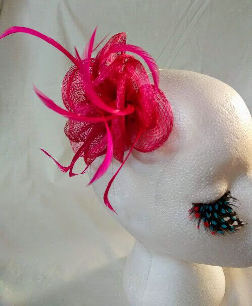 Bonito tocado para ceremonia color rosa fucsiacon forma de flor confeccionado con rafia y plumas.
