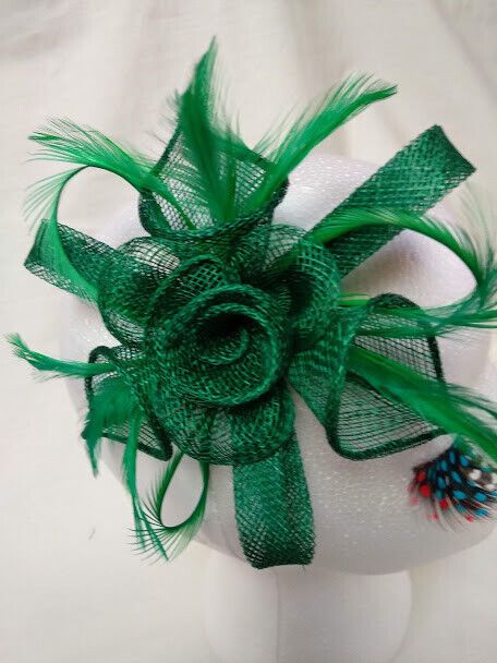 Bonito tocado para ceremonia color verde con forma de flor confeccionado con rafia y plumas